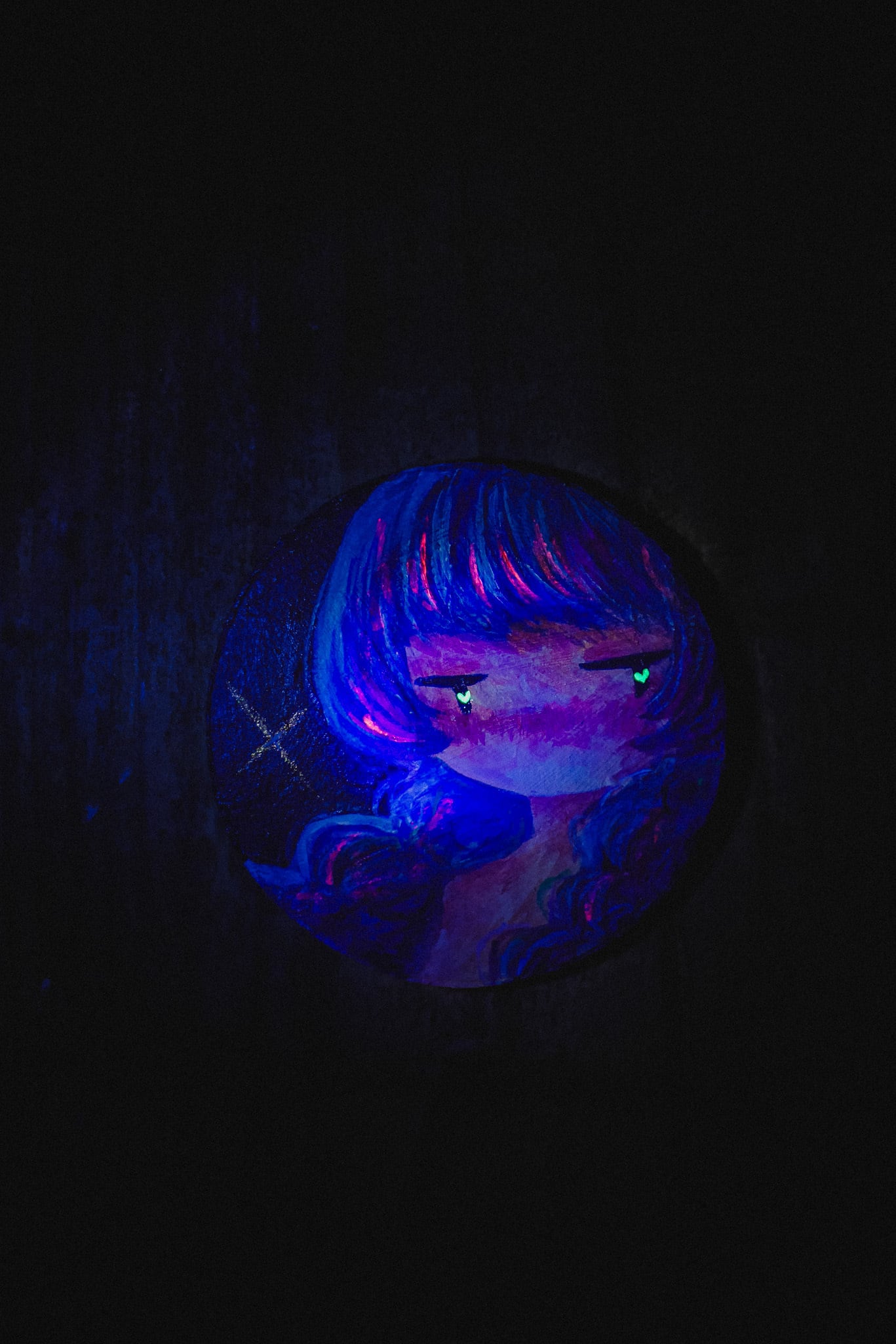 ブラックライト・ブルーライトで光を当てると作品の一部が発光します。ぜひお楽しみください